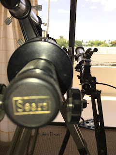 Well, I made my way up to the second floor balcony of the common area, and what did I find? Two telescopes. One larger one (from Sears, no less) and one smaller one. What's the problem? The place these tripod peepers are located, are facing another building. Which means the residents of this complex are spying on their neighbors. Guess they need something to do during bad weather?